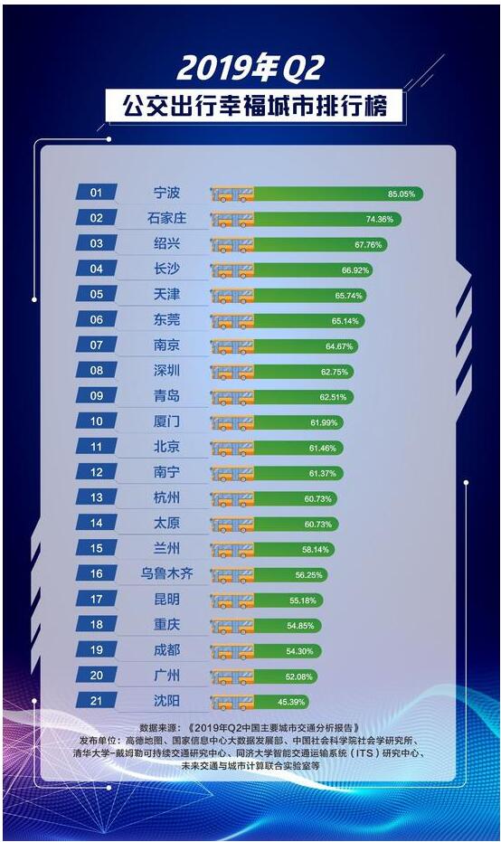 数据显示,二季度城市公交出行方面,宁波、石家庄、绍兴等城市的地面公交出行幸福指数较高,意味着这些城市的公交运行效率、可靠性、相对城市交通水平的综合表现较好。