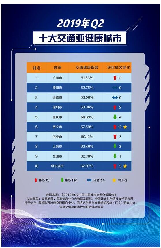 城市道路交通方面,在2019年二季度监测的50个城市的交通健康指数排名来看,广州交通健康指数最低,为51.83%,位居二季度城市交通亚健康榜单之首,其余排名前十城市分别为贵阳、北京、深圳、重庆、西宁、西安、上海、兰州、哈尔滨,TOP10中南北方城市各占一半。
