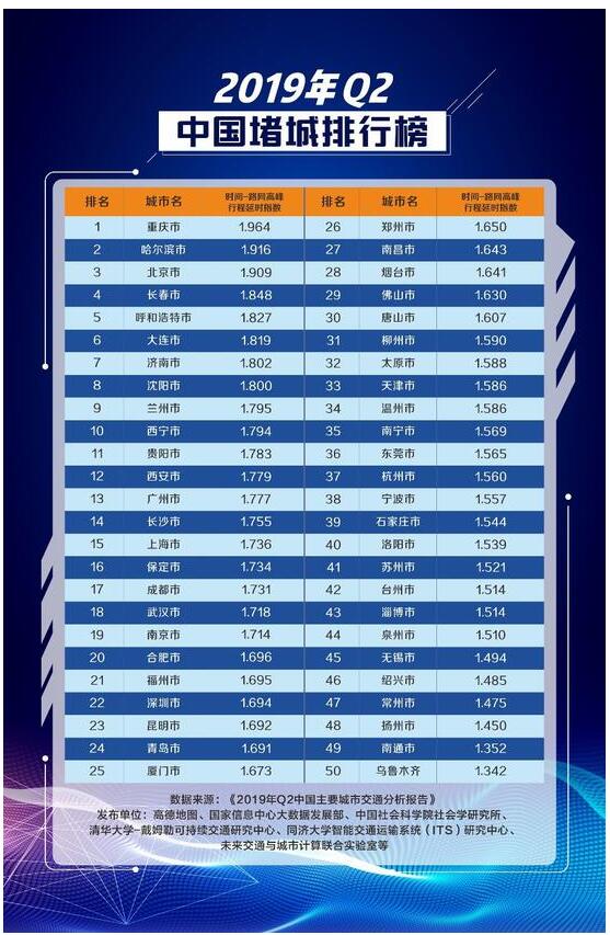 根据高德地图交通大数据监测的50个主要城市结果显示,2019Q2重庆路网高峰行程延时指数1.964,平均车速24.95km/h,高峰拥堵延时指数本季最高;本季十大堵城依次为重庆市、哈尔滨市、北京市、长春市、呼和浩特市、大连市、济南市、沈阳市、兰州市、西宁市,前十城市中9个位于北方。