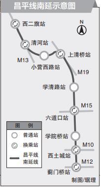 市轨道交通建设管理公司二中心工程九部部长赵克生介绍,昌平线南延工程全长12.6公里,包含既有车站西二旗站,另设8个新建车站,由北向南分别新建清河站、小营西路站、上清桥站、学清路站、六道口站、学院桥站、西土城站、蓟门桥站。其中,小营西路站为最新增设的车站,也是昌平线南延唯一还未开工的场地。8座新建车站中,将包括5座换乘站:清河站可以换乘地铁13号线、未来的地铁19号线支线;上清桥站可以换乘地铁19号线主线;六道口站可以换乘地铁15号线;西土城站可以换乘地铁10号线;蓟门桥站可换乘正在建设的地铁12号线。