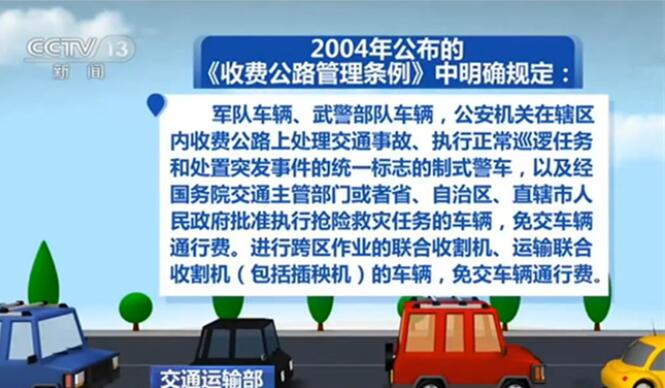 2004年公布的《收费公路管理条例》中明确规定,军队车辆、武警部队车辆,公安机关在辖区内收费公路上处理交通事故、执行正常巡逻任务和处置突发事件的统一标志的制式警车,以及经国务院交通主管部门或者省、自治区、直辖市人民政府批准执行抢险救灾任务的车辆,免交车辆通行费。进行跨区作业的联合收割机、运输联合收割机(包括插秧机)的车辆,免交车辆通行费。