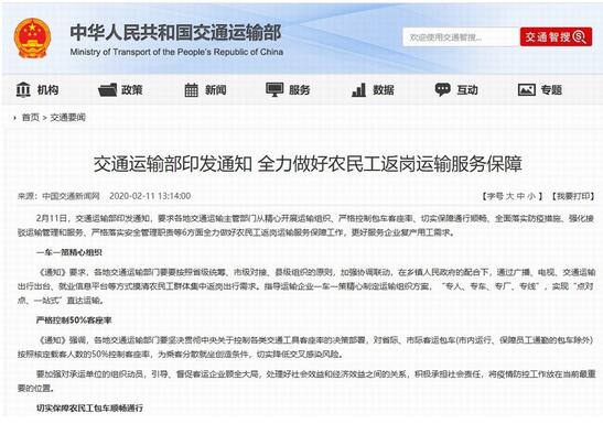 交通运输部网站2月11日消息,当日,交通运输部印发通知,要求各地交通运输主管部门从精心开展运输组织、严格控制包车客座率、切实保障通行顺畅、全面落实防疫措施、强化接驳运输管理和服务、严格落实安全管理职责等6方面全力做好农民工返岗运输服务保障工作,更好服务企业复产用工需求。