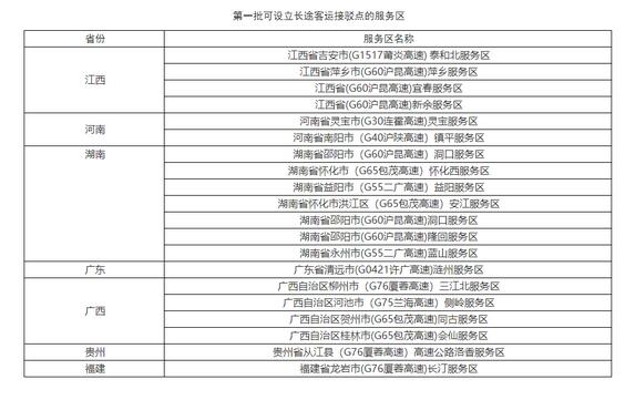 经农民工输出、输入重点省份省级交通运输主管部门摸排,交通运输部遴选了第一批可设立长途客运接驳点的服务区(见附件),后续将根据地方意见建议,滚动公布。