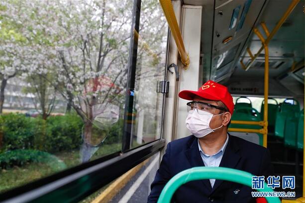 3月25日,在武昌火车站综合体站始发的首趟518路公交车上,安全员熊伟望着窗外路边的樱花。 当日起,武汉市部分公交车恢复开行。 新华社记者 沈伯韩 摄