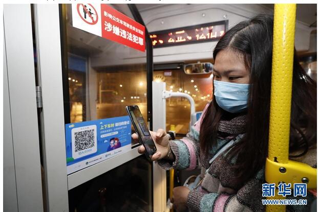 3月25日,在武昌火车站综合体站始发的首趟518路公交车上,乘客用手机支付宝APP扫码实名登记,显示健康绿码后方可乘车。 当日起,武汉市部分公交车恢复开行。 新华社记者 沈伯韩 摄