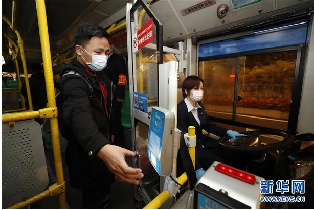 3月25日,乘客上车后刷卡购票。 当日起,武汉市部分公交车恢复开行。 新华社记者 沈伯韩 摄