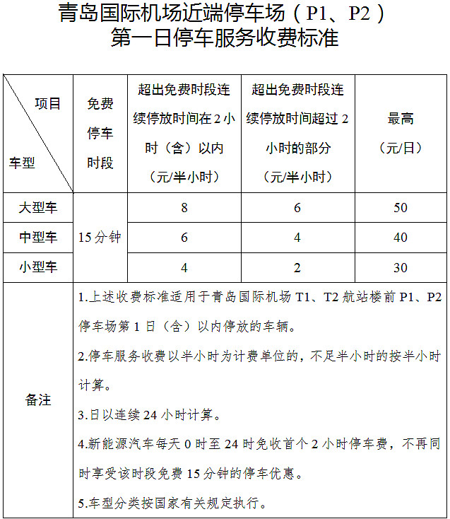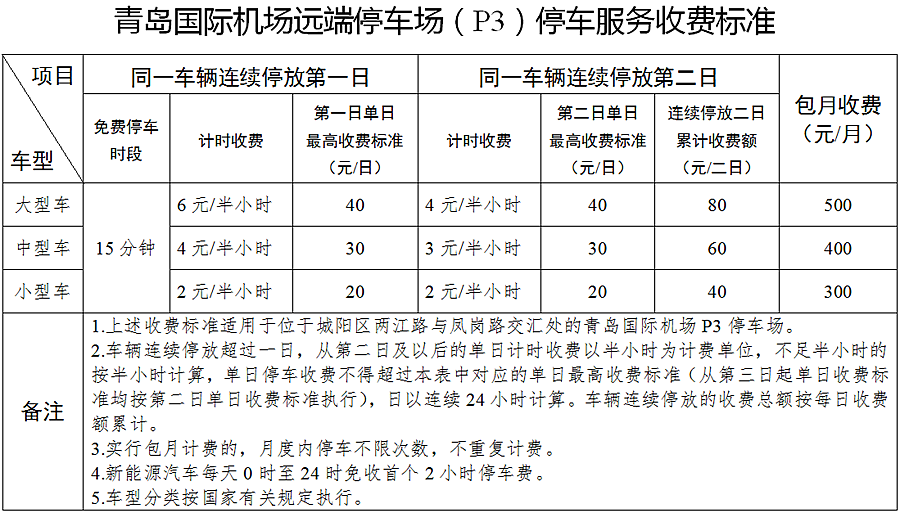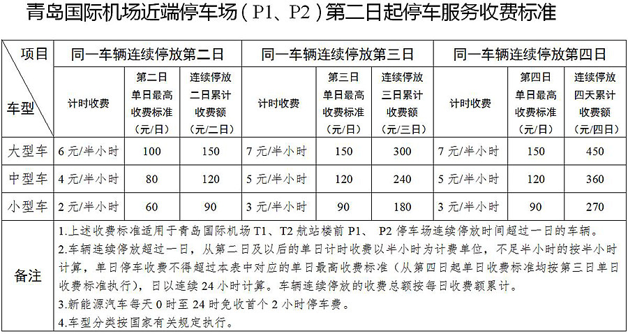 以小型车为例,同一车辆在青岛国际机场近端停车场(P1、P2)连续停放超过一日的,第二日停车服务收费标准按2元/半小时执行,日最高收费标准为60元。连续停放第三日,停车服务收费标准按3元/半小时执行,日最高收费标准为90元。从第四日起,单日收费标准均按第三日单日收费标准执行。同一车辆在青岛国际机场远端停车场(P3)连续停放超过一日的,第二日停车服务收费标准按2元/半小时执行,日最高收费标准为20元。从第三日起,单日收费标准均按第二日单日收费标准执行。