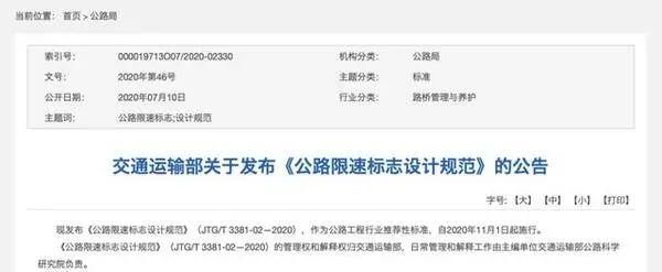 交通运输部近期发布了《公路限速标志设计规范》公告,将进一步规范全国限速标志设计,自2020年11月1日起施行。大量不合理的限速标志将会面临拆除。