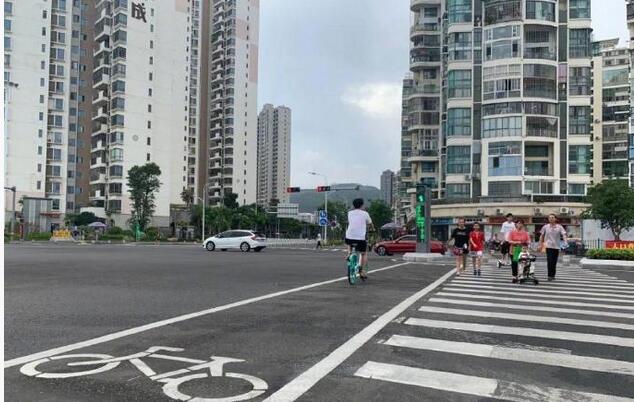 现场照片显示,厦门海沧区部分路口的斑马线被“一分为二”,一侧为人行道,另一侧没有“斑马线”,而是画上了自行车道标志线,路面上标注了自行车标志,自行车和电动车在过马路时可以走专用的车行道。