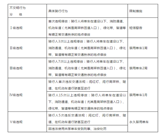西安市三家共享单车企业约定,共同对多次违规停放、私占破坏车辆、闯行高架桥(隧道)、在机动车道行驶或逆行以及因违法用车受到治安处罚等行为的用户建立“不文明骑行者”数据库,实施使用单车违规违停倒查机制。针对不文明骑车用户,将通过人工智能和大数据手段及时发现并归集入库,制定5个等级的分级约束制度,包括短信警告、禁用单车1周、禁用单车2周、禁用单车1月、永久禁用单车,倒逼单车用户规范用车,文明骑行。
