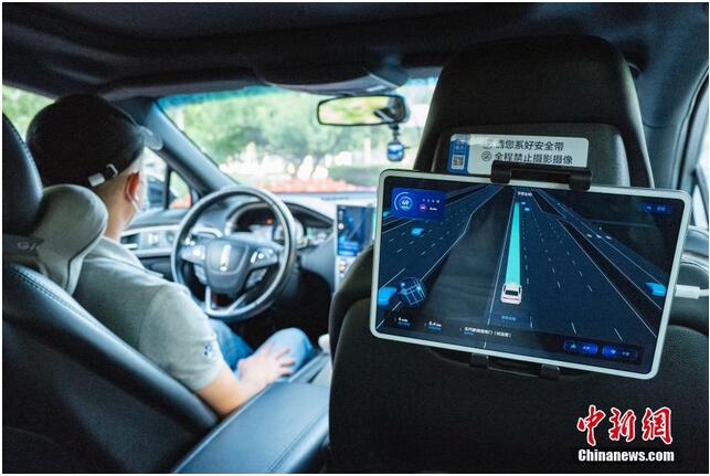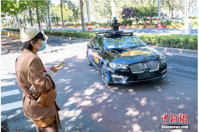 10月13日,百度自动驾驶出租车在道路上行驶。百度自动驾驶出租车服务日前在北京开放,市民可在北京经济技术开发区、海淀区、顺义区的数十个自动驾驶出租车站点,无需预约,直接下单免费试乘自动驾驶出租车服务。