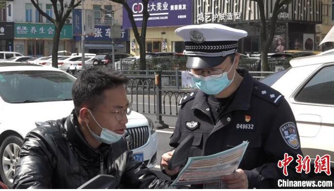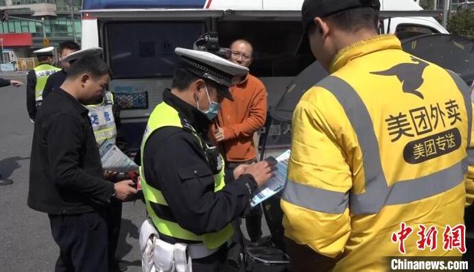交通民警正在向外卖小哥宣传今年5月1日将实施的《上海市非机动车安全管理条例》 张践 摄