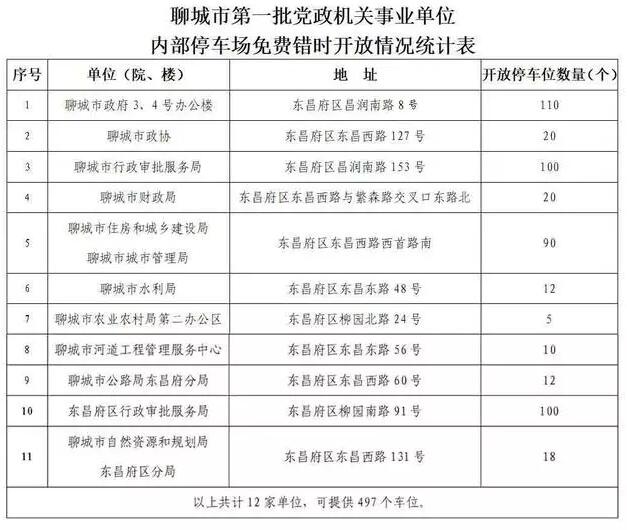 聊城市政府3、4号办公楼、聊城市政协、聊城市财政局、聊城市行政审批服务局、聊城市水利局、聊城市住房和城乡建设局、聊城市城市管理局、聊城市农业农村局第二办公区(原畜牧局院内)、聊城市公路局东昌府分局、聊城市河道工程管理服务中心、聊城市自然资源和规划局东昌府区分局、东昌府区行政审批服务局等12家单位办公区停车场第一批向社会免费错时开放;