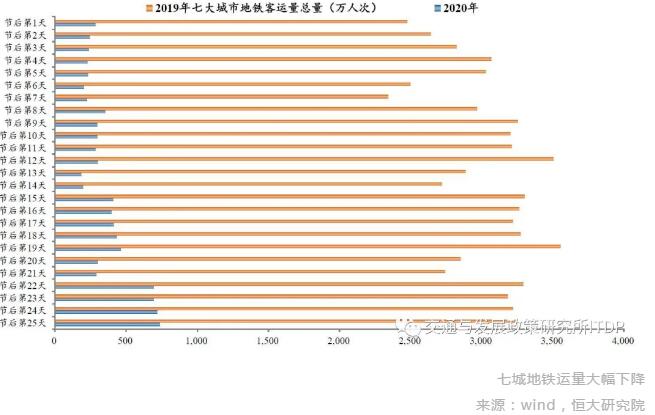 恒大研究院统计得出,上海、广州等7城地铁运量在疫情期间大幅下降,2020年春节第一周客运总量仅为2019年同期的8.8%,第四周(22-25日)有所上升,但仍仅22.3%。